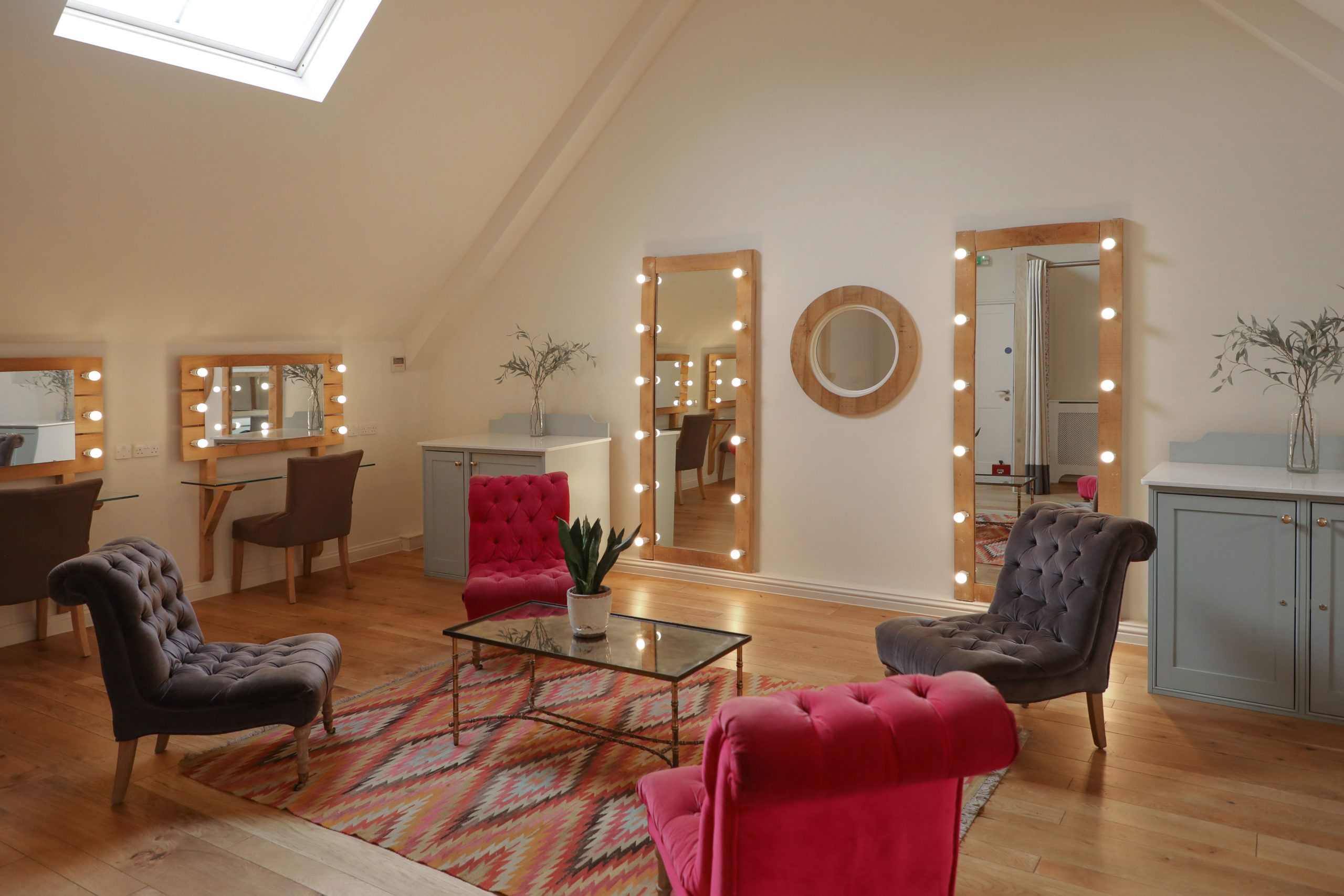 The Loft is the perfect space to start your wedding day in luxurious comfort! With mirrors a plenty, a crystal pendant light, six individual Makeup Stations, an elegant seating area and a private changing area, this room has all you need.