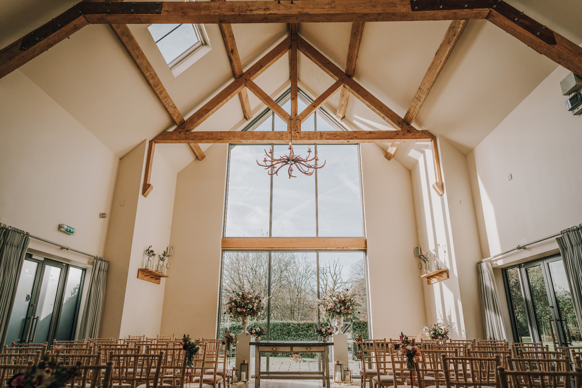 The Ceremony Hall at Millbridge Court combines traditional Barn features with elegant and modern interior design.
